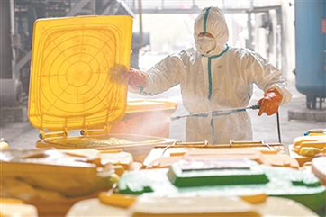 新冠肺炎疫情發(fā)生后,每天產(chǎn)生的巨量醫(yī)療廢物成為武漢市亟待解決的重要問題。圖為近日,在武漢市青山區(qū)云峰公司,工作人員在對(duì)醫(yī)療廢物轉(zhuǎn)運(yùn)箱消毒。新華社記者 才揚(yáng) 攝3月11日,記者從國(guó)務(wù)院聯(lián)防聯(lián)控機(jī)制新聞發(fā)